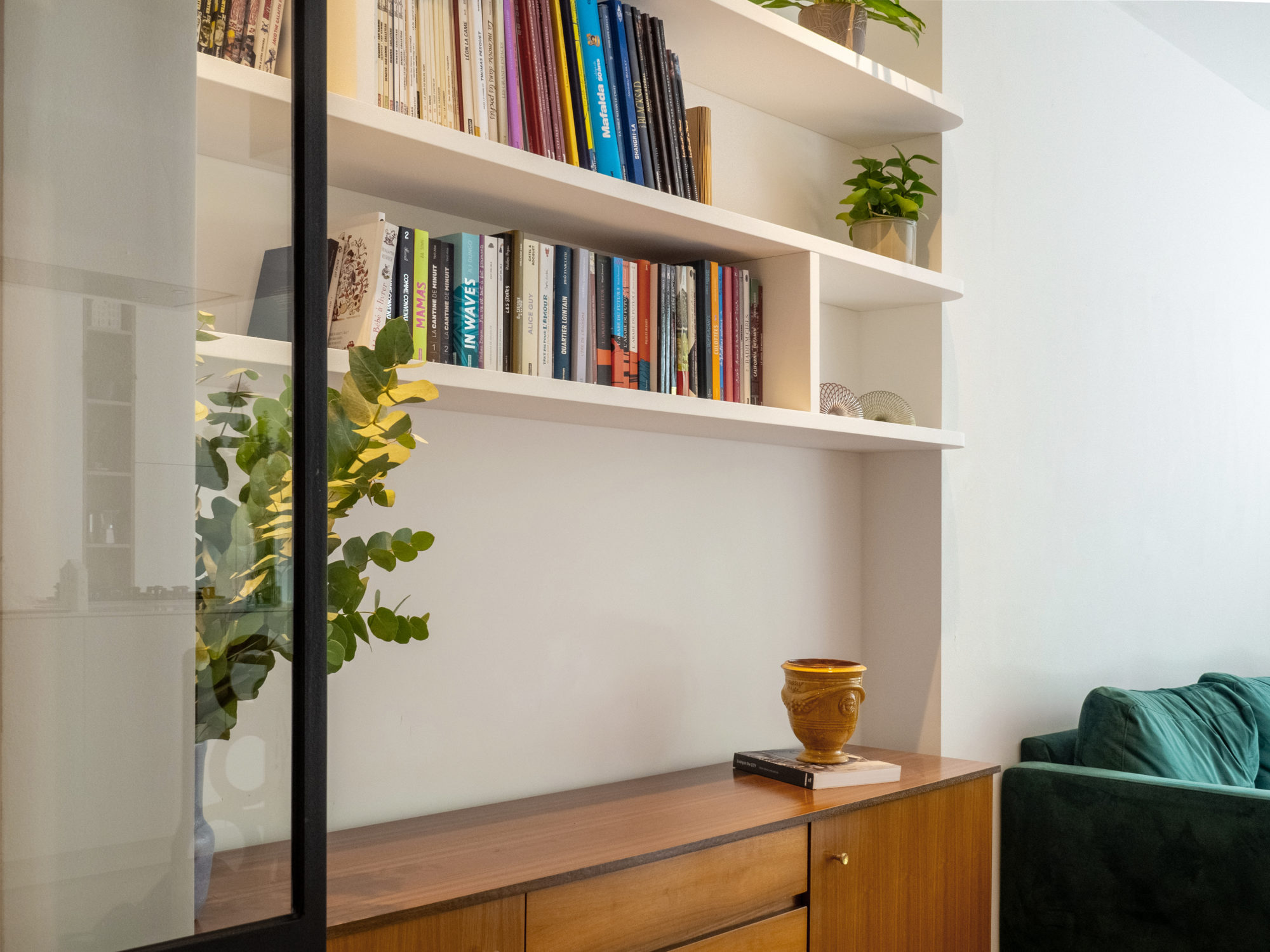 Living in a typical 1930’s Amsterdam apartment, the project of this family of 4 was to create an additional bedroom while preserving the current layout, charm and level of details: the functional open kitchen circulation, lots of books to store and a set of steel doors.